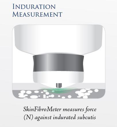 The SkinFibroMeter consists of a 1.25 mm length indenter and two force sensors. The device is briefly pressed against the skin and the contact force is registered. The indenter imposes a constant deformation when the instrument is in full contact with the skin. The skin and the underlying upper subcutis resist the deformation and the induration value in Newtons (N) is determined.